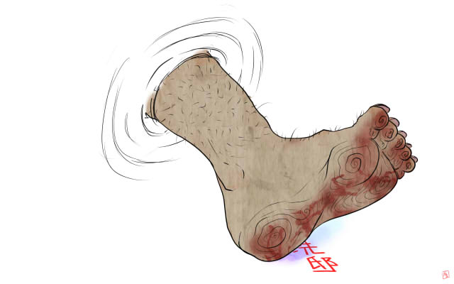 真夜中、デッカイ足を天井から突き刺して、怖がってる家人に「足を洗ええ!」って怒鳴るんだって。