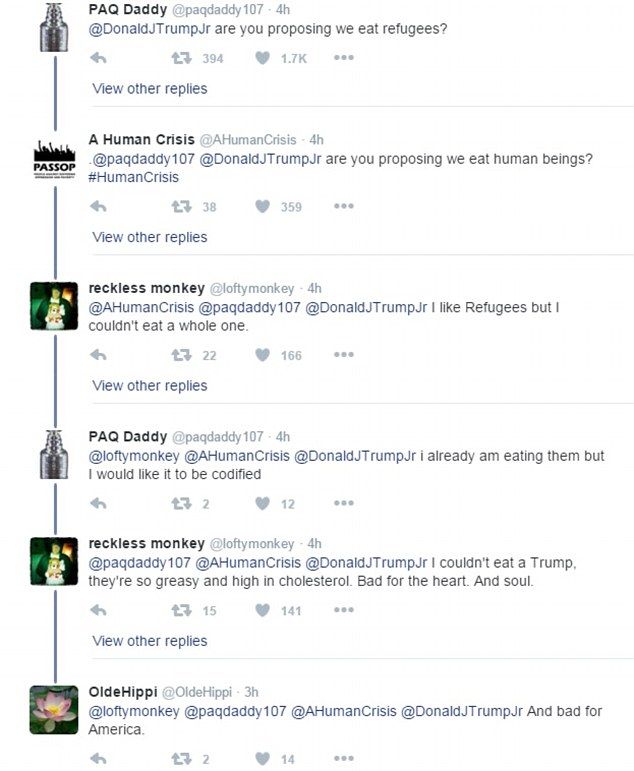 トランプ氏の選挙運動にもたびたび登場するドナルド・トランプ・ジュニア氏は、カラフルなフルーツキャンディー「スキットルズ」が山盛りに入ったボウルの写真に、「私がボウル1杯のスキットルズを持っていて、この中に3粒だけ食べたら死ぬものが交ざっていると言ったら、あなたは片手一杯分持っていくだろうか? これがわれわれのシリア難民問題だ」というメッセージが添えられた画像を投稿。「この画像が全てを語っている」とのコメントを添えた。